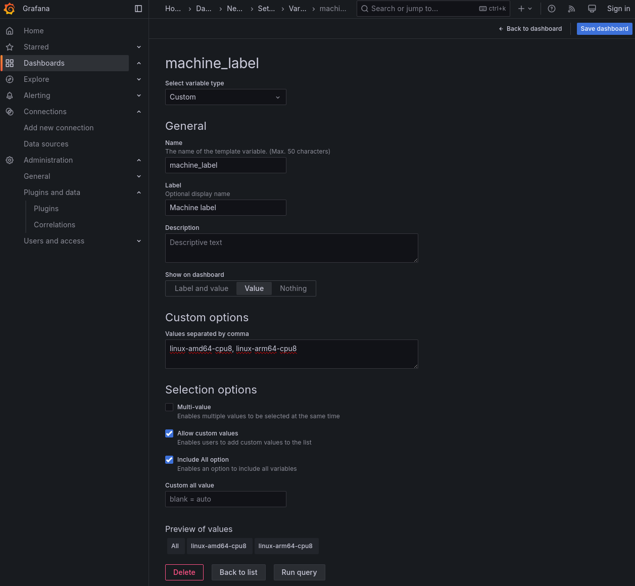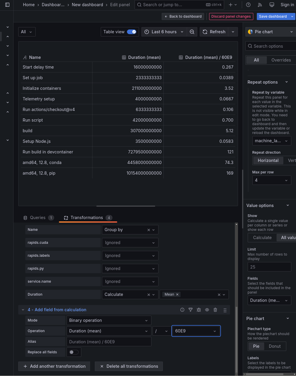 Grafana has something called “dashboard variables,” which serve to select some value for a particular dimension. Using this as the input to the data filters makes it easy to make multiple plots for different values of the variable (e.g. different machine labels or different RAPIDS repos)